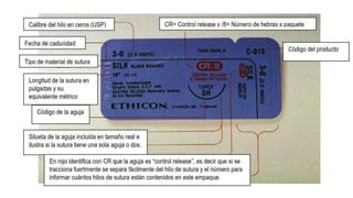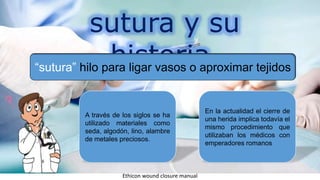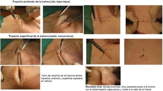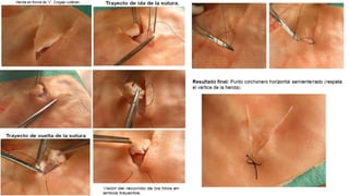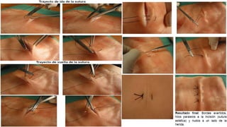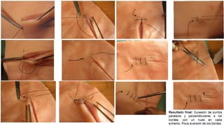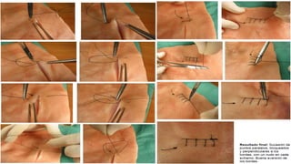 El documento describe los tipos y características de materiales para sutura, incluyendo suturas absorbibles y no absorbibles de origen natural y sintético. También cubre las características de las agujas quirúrgicas y diferentes técnicas de sutura, como nudos cuadrados y con instrumental. Finalmente, discute factores como el tiempo de retirada de puntos y posibles complicaciones de la sutura.