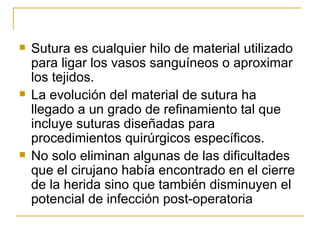 El documento describe diferentes tipos de suturas quirúrgicas, incluyendo suturas absorbibles como el Vicryl y el PDS, y no absorbibles como la seda quirúrgica, el nylon y el poliéster. Explica las propiedades deseables de una sutura como fuerza tensil, diámetro uniforme y aceptación óptima del tejido. También compara las ventajas e inconvenientes de los diferentes materiales utilizados en suturas quirúrgicas.