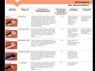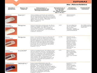 Este documento describe diferentes tipos de suturas utilizadas en cirugía, incluyendo puntos simples, puntos invertidos, puntos de colchonero vertical u horizontal, y suturas continuas. Explica las características y técnicas de cada tipo de sutura.