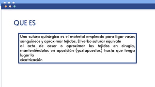 El documento clasifica y describe los diferentes tipos de suturas quirúrgicas. Las suturas se clasifican según su número de hebras, su capacidad de absorción y su material. Las suturas monofilamento son de una sola hebra y tienen menos reacción tisular, mientras que las multifilamento tienen varias hebras trenzadas y mayor flexibilidad. Las suturas también se clasifican como absorbibles o no absorbibles dependiendo de si son degradadas por el cuerpo. El documento procede a describir varios tipos comunes de suturas, sus prop