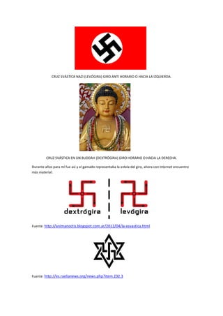 La esvástica ha sido usada como símbolo por varias culturas antiguas con significados positivos como la buena suerte y la reencarnación. Aunque los nazis la adoptaron como su emblema, su origen se remonta miles de años atrás. Existen varias teorías sobre su origen, incluyendo que podría representar la visión de un cometa o ser un símbolo inconsciente del cuerpo humano.