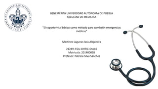 El documento habla sobre el soporte vital básico (SVB) como método para combatir emergencias médicas. Explica que el SVB incluye maniobras como evaluar la escena, activar el sistema de emergencias, comprobar el pulso, iniciar RCP con 30 compresiones y 2 ventilaciones, y usar un desfibrilador externo automático. También cubre cómo aplicar el SVB a lactantes con compresiones en la arteria braquial y proporciones diferentes de compresiones a ventilaciones.