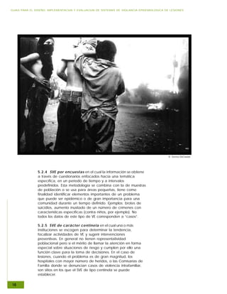El documento describe los tipos y atributos de los sistemas de vigilancia epidemiológica de lesiones. Explica que existen varios tipos de sistemas como los universales, de muestras poblacionales, basados en registros, de encuestas y centinelas. También describe los atributos clave de un sistema como simplicidad, flexibilidad, aceptabilidad, sensibilidad, valor predictivo positivo, representatividad y oportunidad.