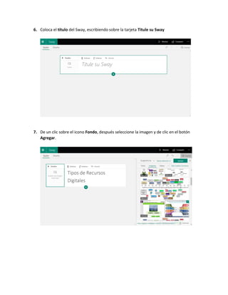 Este documento proporciona instrucciones paso a paso para crear un Sway en 23 pasos. Estos incluyen ingresar a la aplicación Sway en Office.com, agregar un título, fondo, tarjetas de texto, imágenes, videos y audio, personalizar el diseño y estilo, y compartir el Sway copiando el enlace para pegarlo en OneNote o Teams.
