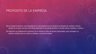 Sweet Cosméticos es una empresa de cosméticos ubicada en la Ciudad de México que ofrece productos y servicios de belleza de alta calidad a precios accesibles. Su misión es satisfacer las necesidades de sus clientes mediante la provisión de productos y servicios de cuidado personal. A corto plazo, la empresa busca posicionarse en el mercado occidental de México y satisfacer a sus clientes con servicios de calidad.