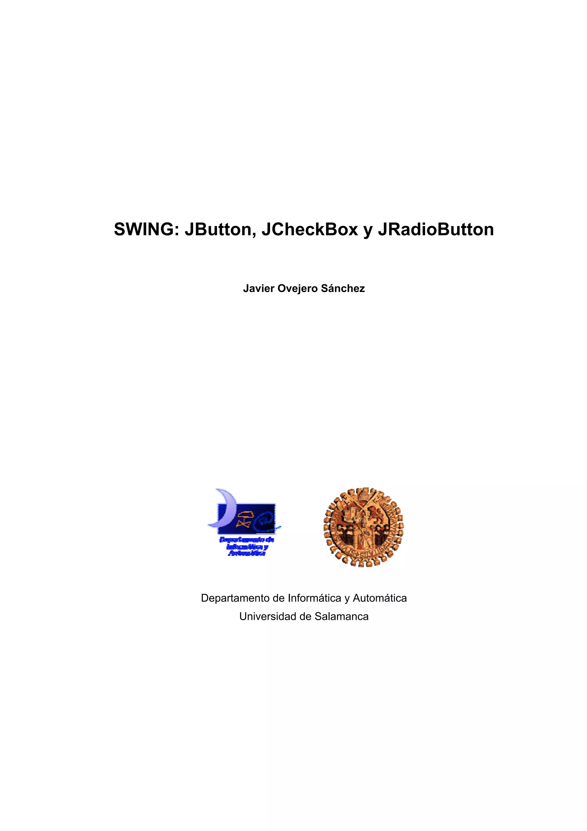 Este documento describe los componentes JButton, JCheckBox y JRadioButton que forman parte de Swing en Java. Explica que Swing mejoró sobre AWT al proporcionar componentes más flexibles y con un diseño orientado a componentes. Luego describe las características y métodos de cada clase de componente junto con ejemplos de su uso.
