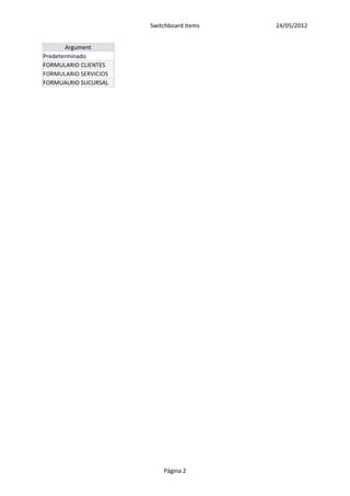El documento lista los elementos del panel de control de una centralita telefónica, incluyendo tres formularios (Clientes, Servicios y Sucursal) accesibles a través de los números 1, 2 y 3 respectivamente en el menú principal del panel de control identificado con el ID 1.