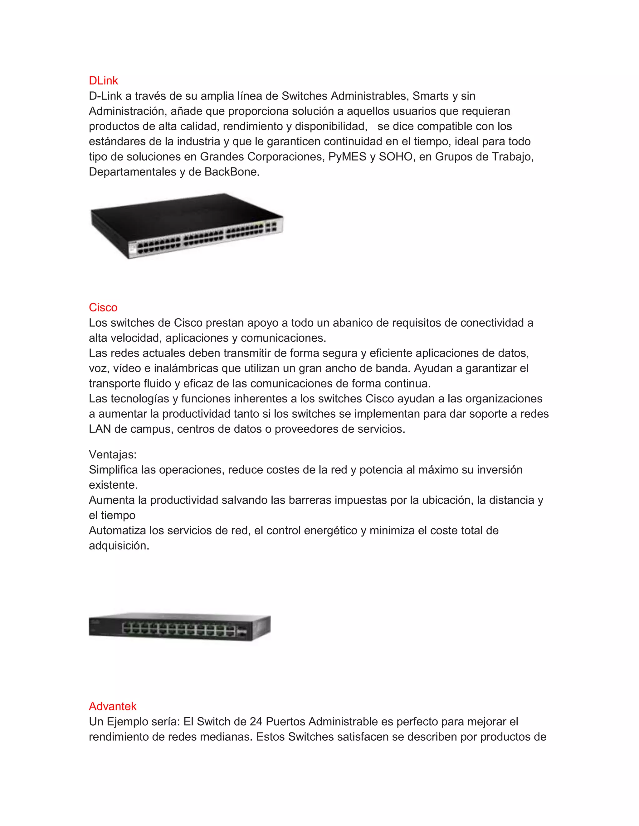 El documento compara varias marcas de switches de red, incluyendo D-Link, Cisco, Advantek, Corega y Allied Telesis. Describe las características, especificaciones y usos propuestos de los switches de cada marca, destacando su rendimiento, capacidad, calidad, facilidad de uso y aplicaciones para empresas pequeñas, medianas y grandes.