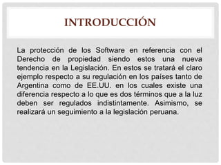 El documento compara la protección jurídica del software en Argentina, Estados Unidos y Perú. Explica que Argentina se basa principalmente en la legislación de derechos de autor, mientras que Estados Unidos utiliza derechos de autor, patentes y secretos comerciales. Además, señala que la piratería online es un gran problema en Perú y ha reducido significativamente las ventas legítimas de software.