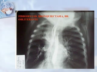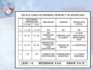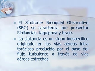 El documento describe el síndrome bronquial obstructivo (SBO), caracterizado por sibilancias, taquipnea y tiraje torácico, generalmente causado por infecciones virales respiratorias como el virus respiratorio sincitial. Explica los signos y síntomas, la anatomía patológica, el diagnóstico a través de radiografías y pruebas para detectar agentes infecciosos, y el tratamiento con esteroides orales o inhalados para reducir la inflamación y la gravedad de los episodios.