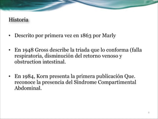 Este documento describe la historia, definición, clasificación, factores de riesgo, efectos y manejo de la hipertensión intraabdominal (HIA) y el síndrome compartimental abdominal (SCA). Brevemente resume que la HIA se define como una presión intraabdominal patológica mayor a 12 mmHg, y el SCA como una presión mayor a 20 mmHg asociada a disfunción orgánica. También describe los efectos hemodinámicos, gastrointestinales, pulmonares y renales de la HIA/SCA, así como su manejo