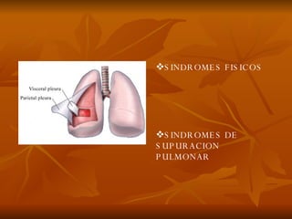 El documento describe varios síndromes pulmonares, incluyendo síndromes de condensación como neumonía, bronconeumonía e infarto pulmonar; síndromes de supuración como absceso pulmonar; y síndromes de rarefacción como atelectasia pulmonar y enfisema. Explica los signos clínicos, hallazgos radiológicos y etiologías asociadas a cada síndrome.