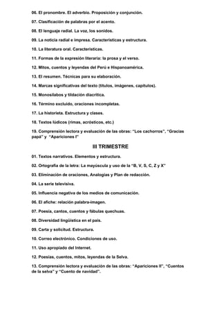 Este documento presenta el silabus del curso de Comunicación Integral del primer año de secundaria en la Institución Educativa "Nuestra Señora de Montserrat" para el año 2012. El silabus describe los temas que se cubrirán a lo largo de los tres trimestres, incluyendo elementos de la comunicación, gramática, tipos de textos, medios de comunicación y literatura peruana e hispanoamericana.