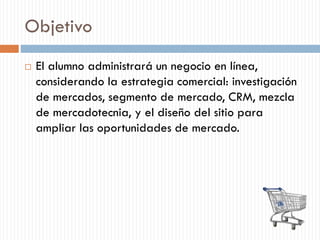 Este documento presenta un curso de comercio electrónico dividido en 4 unidades. La primera unidad cubre los medios de información electrónicos y la segmentación de mercados en línea. La segunda unidad trata sobre el servicio al cliente utilizando CRM y redes sociales. La tercera unidad se enfoca en el desarrollo de productos virtuales y estrategias de negocios en línea. Finalmente, la cuarta unidad cubre el diseño y administración de sitios web para negocios en línea.