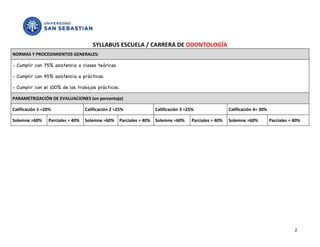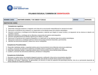 Este documento presenta el syllabus de un curso de Anatomía General y de Cabeza y Cuello para una carrera de Odontología. El objetivo del curso es desarrollar conocimientos y habilidades en anatomía que serán fundamentales para la práctica odontológica. El curso consta de 6 unidades de aprendizaje con contenidos, actividades y evaluaciones. Se incluyen normas como el cumplimiento de asistencia y parámetros de evaluación.