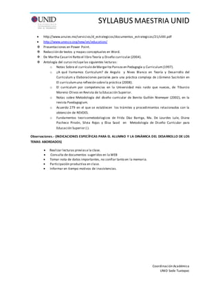 Este documento presenta el syllabus de la asignatura "Curriculum" de la maestría de la UNID Sede Tuxtepec. El objetivo es evaluar diferentes propuestas curriculares y diseñar una propuesta curricular a partir de fundamentos teórico-metodológicos. Cubre temas como enfoques curriculares, estructura curricular, metodología de diseño curricular y evaluación curricular. El curso dura 7 semanas e incluye lecturas, trabajos en equipo y la elaboración de un proyecto de diseño curricular.