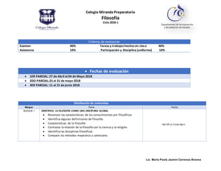 Este documento presenta la planificación de un curso de filosofía para el ciclo 2018-1 en Colegio Miranda Preparatoria. Incluye la información sobre la profesora a cargo, criterios de evaluación, fechas de evaluaciones parciales, y distribución de contenidos en seis bloques temáticos que abarcan desde la filosofía presocrática hasta la filosofía posmoderna.