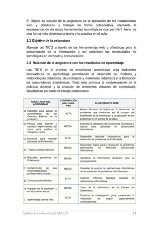 El documento presenta el syllabus de la asignatura Informática I de la carrera de Enfermería de la Universidad Técnica de Machala. El syllabus incluye la justificación, objetivos y contenidos de la asignatura organizados en 3 unidades: 1) Funcionamiento de la computadora y seguridad informática, 2) Web 2.0, y 3) Procesadores de texto y presentaciones. La asignatura busca que los estudiantes aprendan a utilizar herramientas informáticas y web para presentar información de manera profesional en el campo de la salud