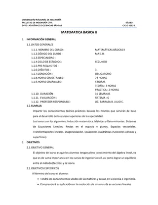 Este documento presenta el sílabo del curso de Matemáticas Básicas II impartido en la Facultad de Ingeniería Civil de la Universidad Nacional de Ingeniería. El curso cubre temas de álgebra lineal como matrices, determinantes, sistemas de ecuaciones lineales, espacios vectoriales y transformaciones lineales. Se evalúa a los estudiantes a través de exámenes parcial y final así como prácticas calificadas, y ofrece bibliografía recomendada para apoyar el aprendizaje de los conceptos.