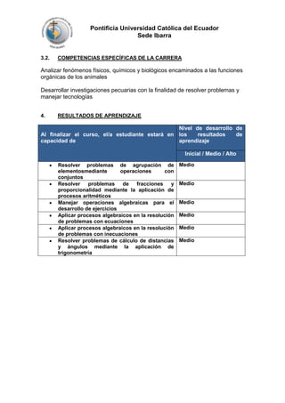 Este documento presenta la descripción de un curso de matemáticas I dictado en la Pontificia Universidad Católica del Ecuador, Sede Ibarra. El curso se enfoca en desarrollar el pensamiento lógico y la resolución de problemas mediante conceptos aritméticos, algebraicos y trigonométricos. El curso dura un semestre y cubre temas como conjuntos, números racionales, álgebra, ecuaciones, desigualdades y trigonometría.