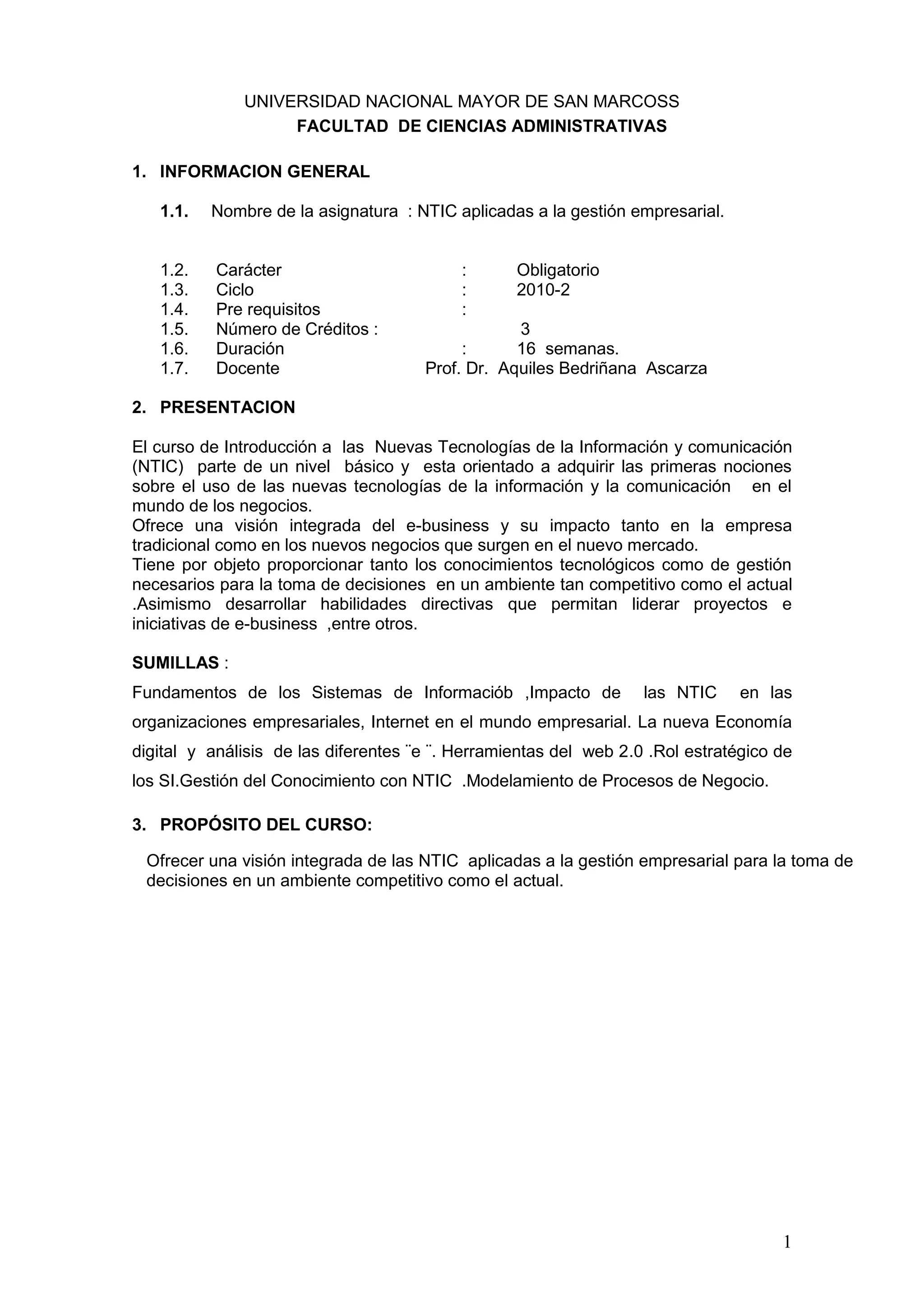 Este documento presenta la información general sobre un curso de NTIC aplicadas a la gestión empresarial. El curso tiene como objetivo ofrecer una visión integrada de las NTIC para la toma de decisiones en entornos competitivos. Cubre temas como fundamentos de sistemas de información, el impacto de las NTIC en organizaciones, herramientas web 2.0, y la gestión del conocimiento y la inteligencia competitiva con NTIC. El curso evalúa a los estudiantes a través de trabajos, exámenes parciales y finales,
