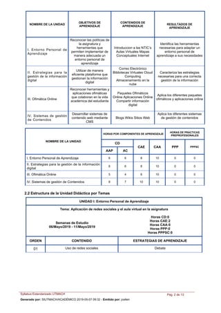 Este documento presenta el syllabus de la asignatura "Nuevas tecnologías de la Información y la comunicación" para estudiantes de primer año de ingeniería civil. La asignatura se divide en 4 unidades didácticas que cubren temas como entornos personales de aprendizaje, gestión de información digital, ofimática en línea y sistemas de gestión de contenidos. La asignatura tiene un total de 120 horas distribuidas entre clases presenciales, aprendizaje colaborativo y autónomo.
