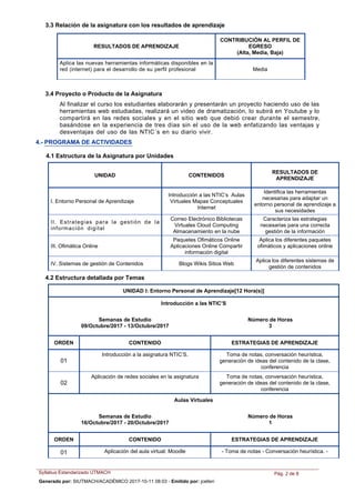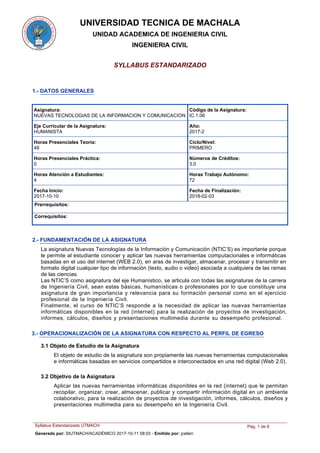 Este documento presenta el syllabus estandarizado de la asignatura "Nuevas Tecnologías de la Información y Comunicación" impartida en la Universidad Técnica de Machala. La asignatura se enfoca en enseñar a los estudiantes a aplicar nuevas herramientas informáticas y de comunicación basadas en Internet. El curso consta de 48 horas de teoría, 72 horas de trabajo autónomo de los estudiantes, y se imparte a estudiantes de primer año de la carrera de Ingeniería Civil. El syllabus describe los objetivos