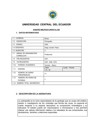 La asignatura de Petrografía estudia el análisis e investigación de los minerales que forman las rocas a través de métodos macroscópicos y microscópicos. El curso cubre cuatro unidades: 1) la tectónica de placas y formación de rocas, 2) rocas ígneas, 3) rocas sedimentarias y metamórficas, y 4) petrografía microscópica. El objetivo es que los estudiantes aprendan a identificar y clasificar rocas, y a observar sus propiedades ó