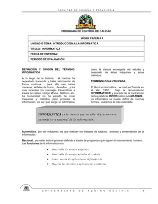 Este documento presenta una introducción a la asignatura de Informática para Ingeniería. Explica que la informática es la ciencia que estudia el tratamiento automático y racional de la información utilizando computadoras. Describe los tres pilares básicos de la informática: hardware, software y el elemento humano. Define hardware como los componentes físicos de un sistema informático y software como las instrucciones que permiten que el hardware procese datos.