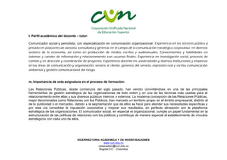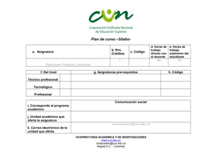 Este documento presenta un plan de curso para la asignatura de Relaciones Públicas y Protocolo. Incluye información sobre los créditos, horas de trabajo, nivel, competencias, sistema de evaluación, bibliografía y el plan de trabajo con 16 sesiones que abarcan temas como el marco conceptual, relaciones con públicos internos y externos, y protocolo empresarial.