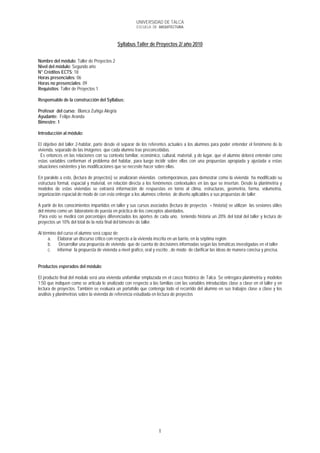 Este documento presenta el syllabus del Taller de Proyectos 2 del segundo año de la Escuela de Arquitectura de la Universidad de Talca. El objetivo del taller es enseñar a los estudiantes a entender el fenómeno de la vivienda separado de imágenes preconcebidas, considerando variables contextuales como la familia, economía y lugar. A lo largo del semestre, los estudiantes analizarán viviendas contemporáneas, desarrollarán una propuesta de vivienda unifamiliar en Talca que demuestre su comprensión de