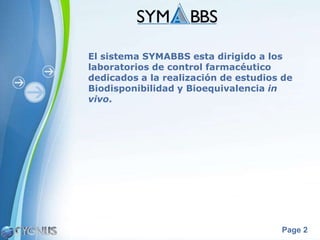 El documento describe el sistema SYMABBS, un sistema de software dirigido a laboratorios de control farmacéutico. El sistema permite el control y administración de estudios de biodisponibilidad y bioequivalencia a través del registro y seguimiento de voluntarios, estudios clínicos, y datos de calidad. El sistema es innovador, fácil de usar, y rápido de implementar.