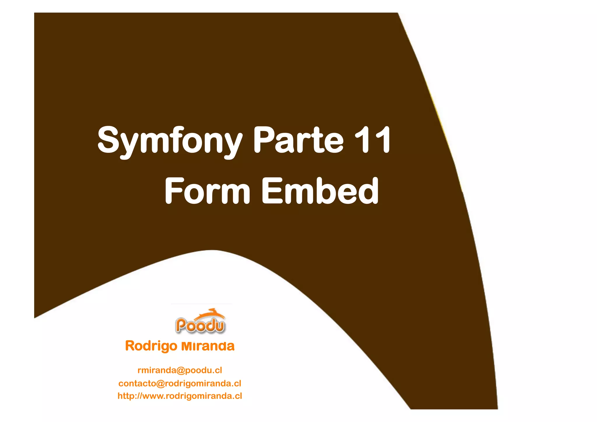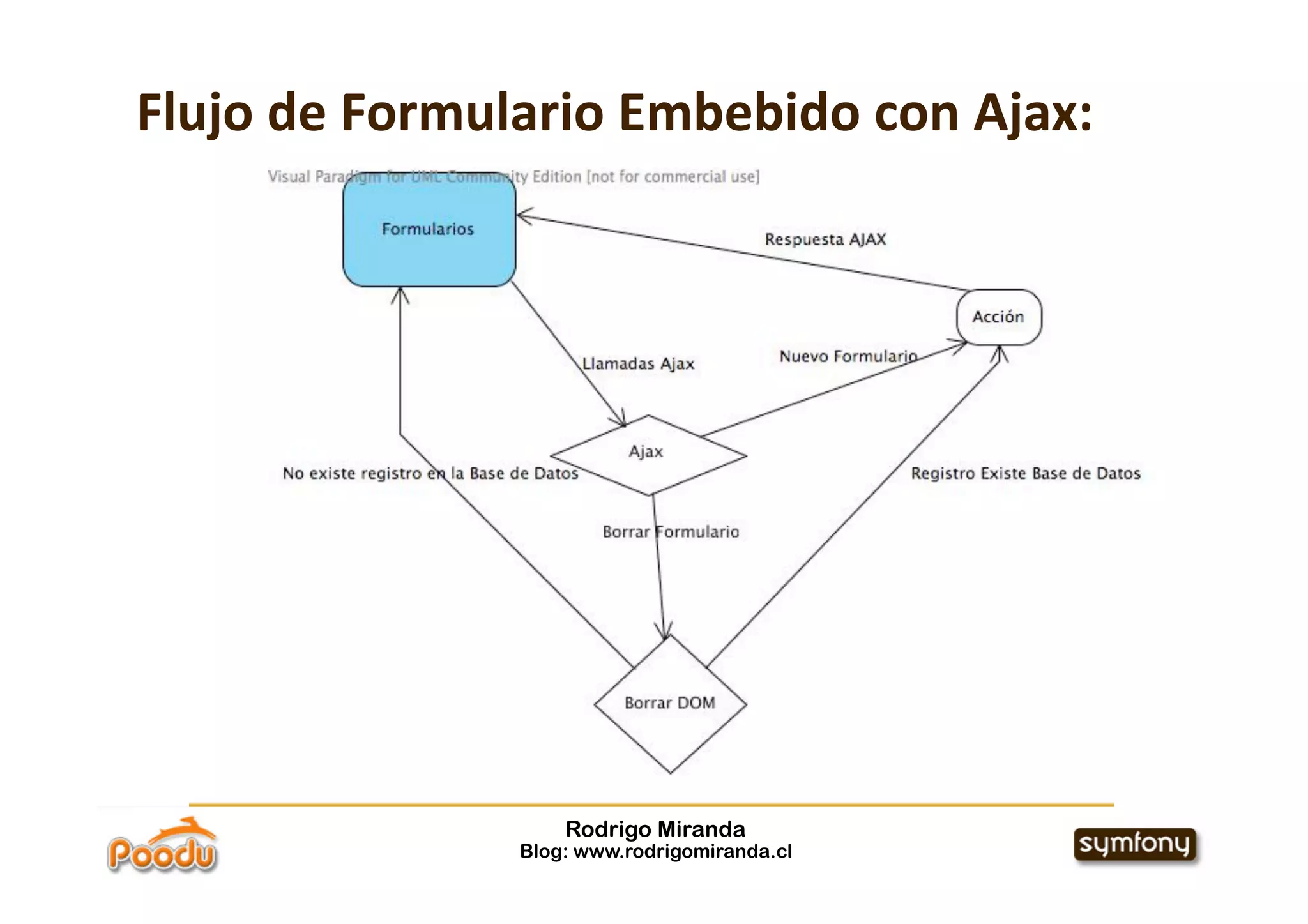 Este documento describe cómo usar formularios embebidos en Symfony con AJAX. Explica cómo instanciar la clase del formulario embebido, mostrar el formulario principal y los embebidos en la plantilla, guardar los registros del formulario y los embebidos, y hacer llamadas AJAX para gestionar los registros embebidos de forma dinámica.