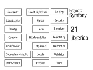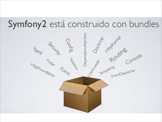 Symfony es un framework PHP que ayuda a organizar el código y las buenas prácticas de desarrollo. Ofrece utilidades como enrutamiento, controladores, vistas, acceso a base de datos, y más. Todo está empaquetado en "bundles" que implementan funcionalidades individuales.