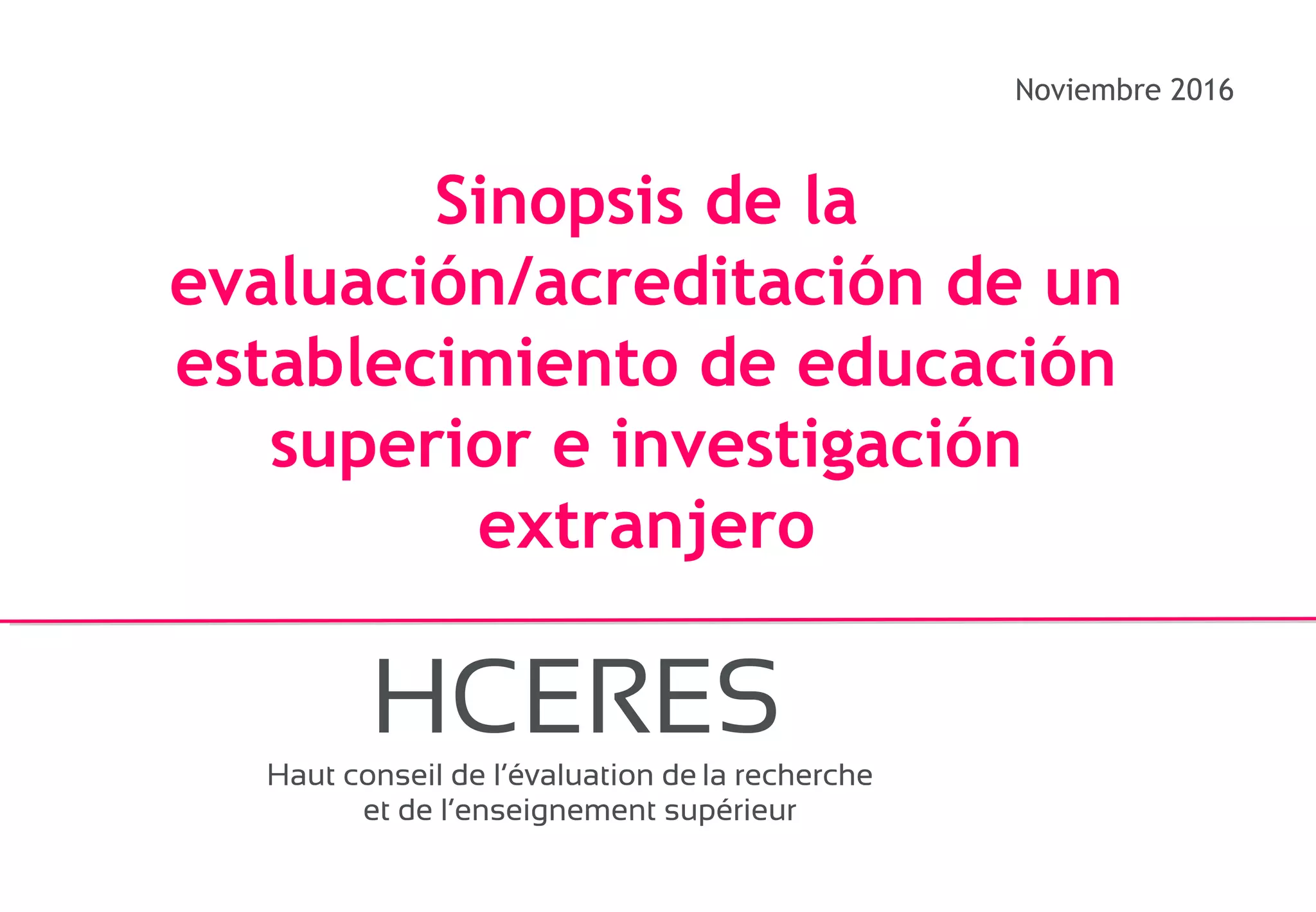 El documento describe el proceso de evaluación y acreditación de instituciones de educación superior por la comisión de acreditación HCERES, enfocándose en seis sectores clave como estrategia, investigación, currículum y calidad. Se detalla la autoevaluación, el papel de un comité de expertos y el proceso de acreditación basado en criterios específicos de calidad. La decisión de acreditación puede ser favorable o desfavorable, con la posibilidad de acreditar por cinco años con o sin condiciones.