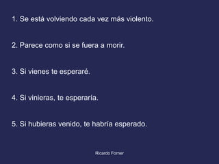 Este documento contiene 34 oraciones de ejemplo en español con traducciones al inglés que ilustran diferentes usos de tiempo verbal y estructuras condicionales. El autor, Ricardo Forner, provee oraciones con verbos en presente, pasado, futuro, condicional simple y compuesto, así como oraciones que incluyen expresiones temporales y condicionales.