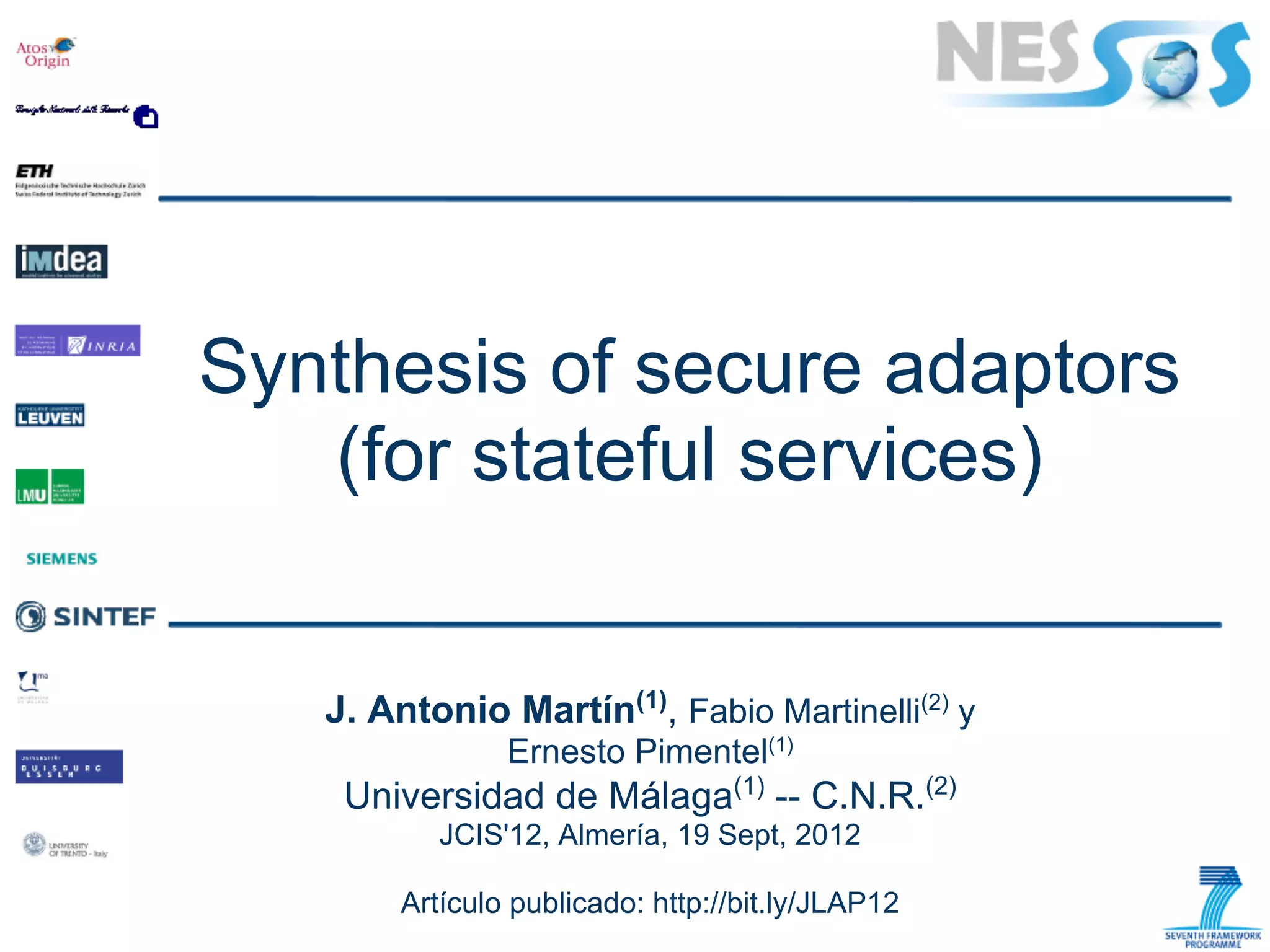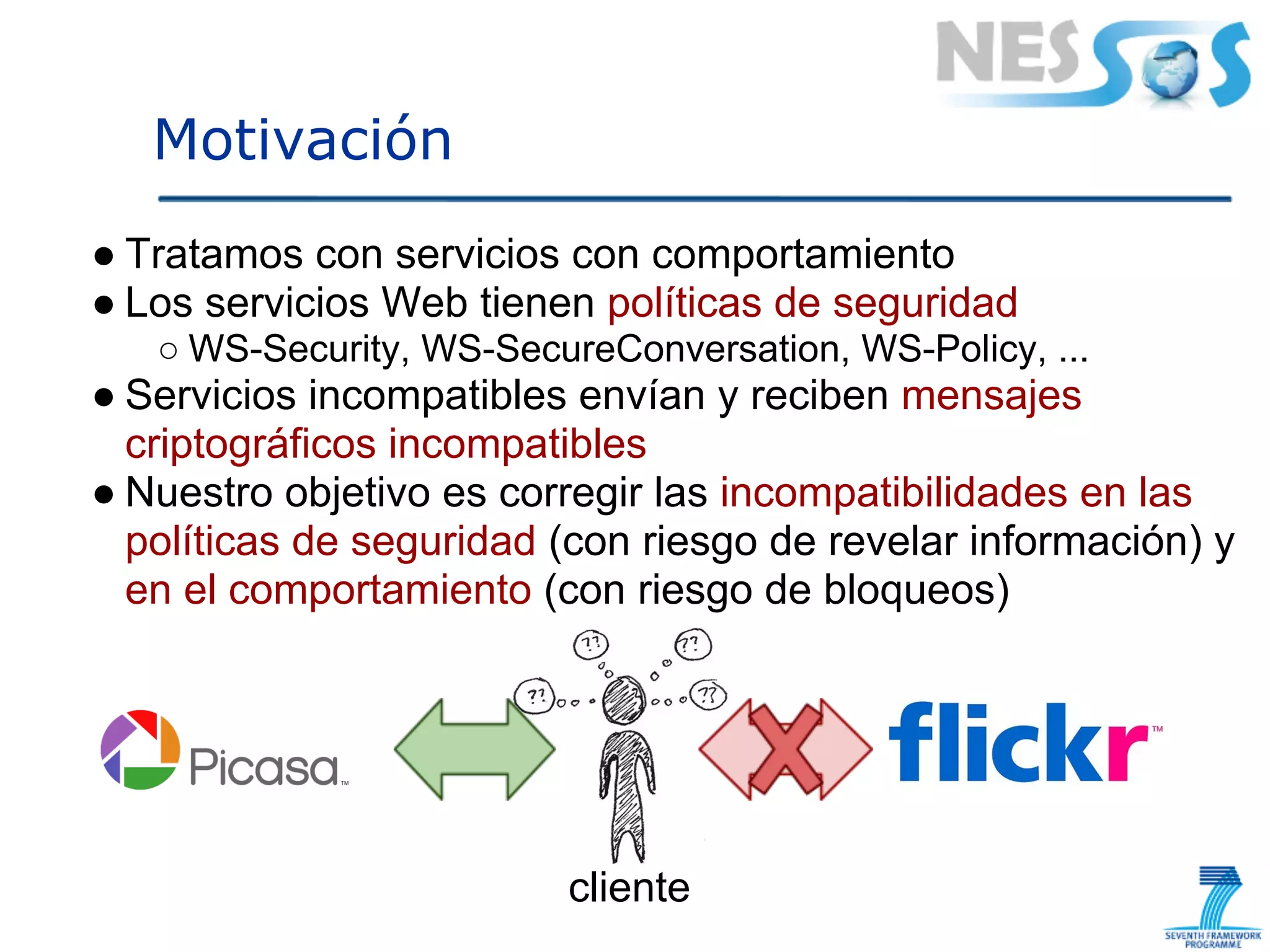 Este documento describe una solución para adaptar servicios con comportamiento y políticas de seguridad incompatibles mediante un adaptador. El adaptador recibe, reescribe y reenvía mensajes para corregir incompatibilidades, extendiendo esta adaptación con criptografía para cumplir las políticas de seguridad. Los adaptadores se describen a través de contratos de adaptación de seguridad que especifican la información y transformaciones necesarias.