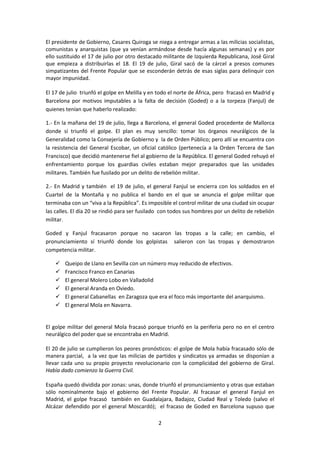 Este documento describe la sublevación militar de 1936 en España y el inicio de la Guerra Civil. Brevemente: 1) En julio de 1936, el general Mola lideró un golpe militar contra el gobierno de izquierda del Frente Popular, pero solo tuvo éxito parcialmente; 2) La falta de liderazgo efectivo en Madrid y Barcelona permitió que el golpe fracasara en esas áreas, dividiendo al país; 3) La guerra civil resultante duró desde 1936 hasta 1939 y consolidó el poder militar de Franco sobre los territorios controlados por los n