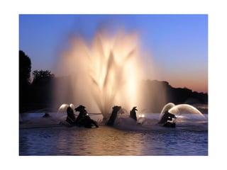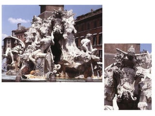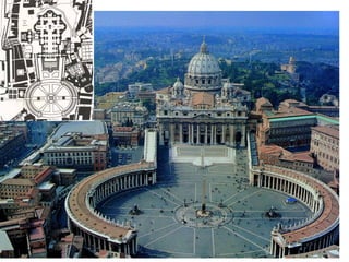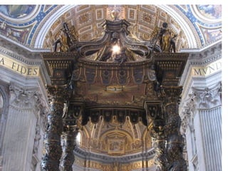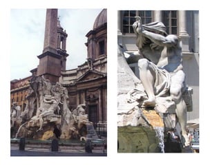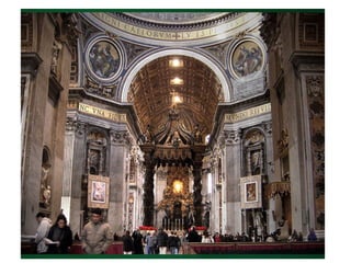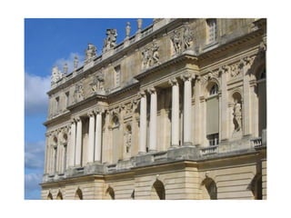 El documento resume la arquitectura barroca en Italia y Francia. En Italia, destaca la obra de Bernini y Borromini, como la basílica de San Pedro y la iglesia de San Carlino. En Francia, se centra en el Palacio de Versalles como ejemplo del barroco cortesano al servicio de la monarquía. La escultura barroca se ilustra con Bernini.