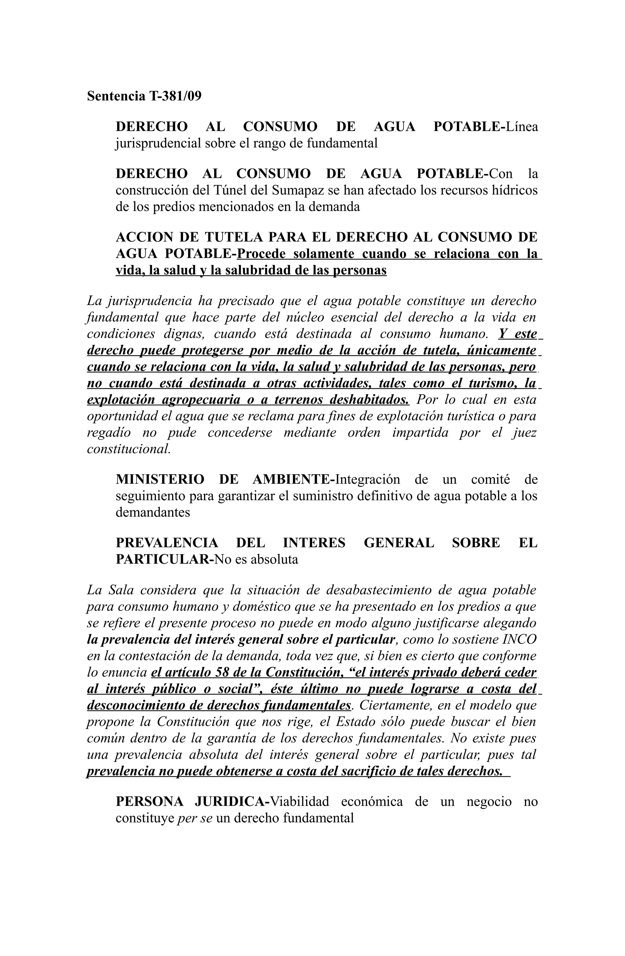 La Corte Constitucional revisa una sentencia de tutela relacionada con el derecho al agua potable de propietarios rurales cuyos manantiales se secaron debido a la construcción de un túnel vial. La Corte encuentra que el derecho al agua potable es fundamental cuando es para consumo humano, y que el interés público no puede prevalecer sobre los derechos fundamentales. Ordena al Ministerio de Ambiente integrar un comité para garantizar el suministro de agua potable a los demandantes y proteger sus derechos fundamentales.