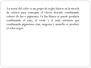 El documento aborda la teoría del color, que se basa en reglas para mezclar colores y la percepción subjetiva que cada individuo tiene de ellos. Se describen los colores primarios, la formación del círculo cromático, y distintos tipos de armonías de color, así como la textura y su importancia en el diseño. Además, se menciona la abstracción en las artes visuales, destacando su conexión con el uso del color y la textura.