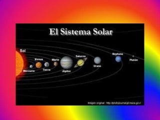 El documento proporciona información sobre el universo y el sistema solar. Explica que el universo contiene galaxias con miles de millones de estrellas, y que nuestra galaxia es la Vía Láctea. Detalla que el sistema solar está compuesto por el Sol y los planetas que giran a su alrededor, incluyendo a la Tierra y su único satélite natural, la Luna. Describe los movimientos de rotación y traslación de la Tierra y la Luna, y cómo la Luna causa las mareas en los océanos de la Tierra