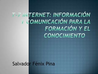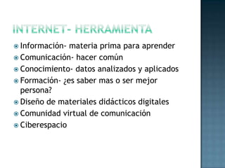 Este documento describe las posibilidades educativas de Internet para la formación y el conocimiento. Internet puede usarse como una herramienta para proporcionar información y facilitar la comunicación entre estudiantes y profesores. El documento también discute el uso de materiales didácticos digitales y comunidades virtuales para apoyar el aprendizaje, y reconoce las dimensiones tecnológica, didáctica y crítica del uso educativo de Internet.