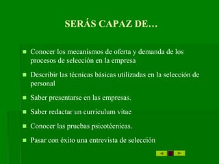 Este documento resume los procesos de selección de personal, incluyendo cómo presentarse a una empresa, redactar un currículum vitae, prepararse para pruebas psicotécnicas y entrevistas. Explica los tipos de cartas, currículums y pruebas de selección, así como consejos para cada etapa del proceso de selección.