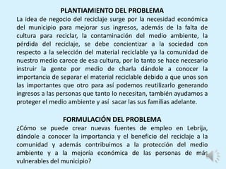 Este documento propone crear una empresa de reciclaje en Lebrija, Santander para generar empleos y concientizar sobre el reciclaje. El estudio de mercado muestra demanda por materiales reciclados. Se requiere capacitar a la comunidad, adquirir maquinaria e instalaciones por $8.4 millones. De un capital de $15 millones, quedarían $6.59 millones para iniciar operaciones.