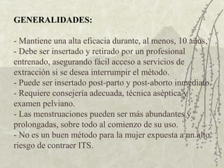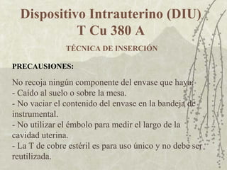 Este documento proporciona instrucciones detalladas sobre cómo insertar y remover un DIU de cobre T Cu 380 A de forma segura y efectiva. Explica los pasos previos, la preparación del DIU, la introducción en el útero, la consejería posterior y la técnica de extracción.