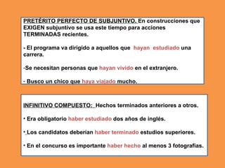 El documento habla sobre el Pretérito Perfecto de Subjuntivo y el Infinitivo Compuesto en español. Estos tiempos verbales se usan para acciones terminadas en el pasado, como "haber estudiado" o "haber viajado". También cubre la voz pasiva, formada con "ser" más el participio, y construcciones con "se" y el futuro, como "se publicará" o "se seleccionará".