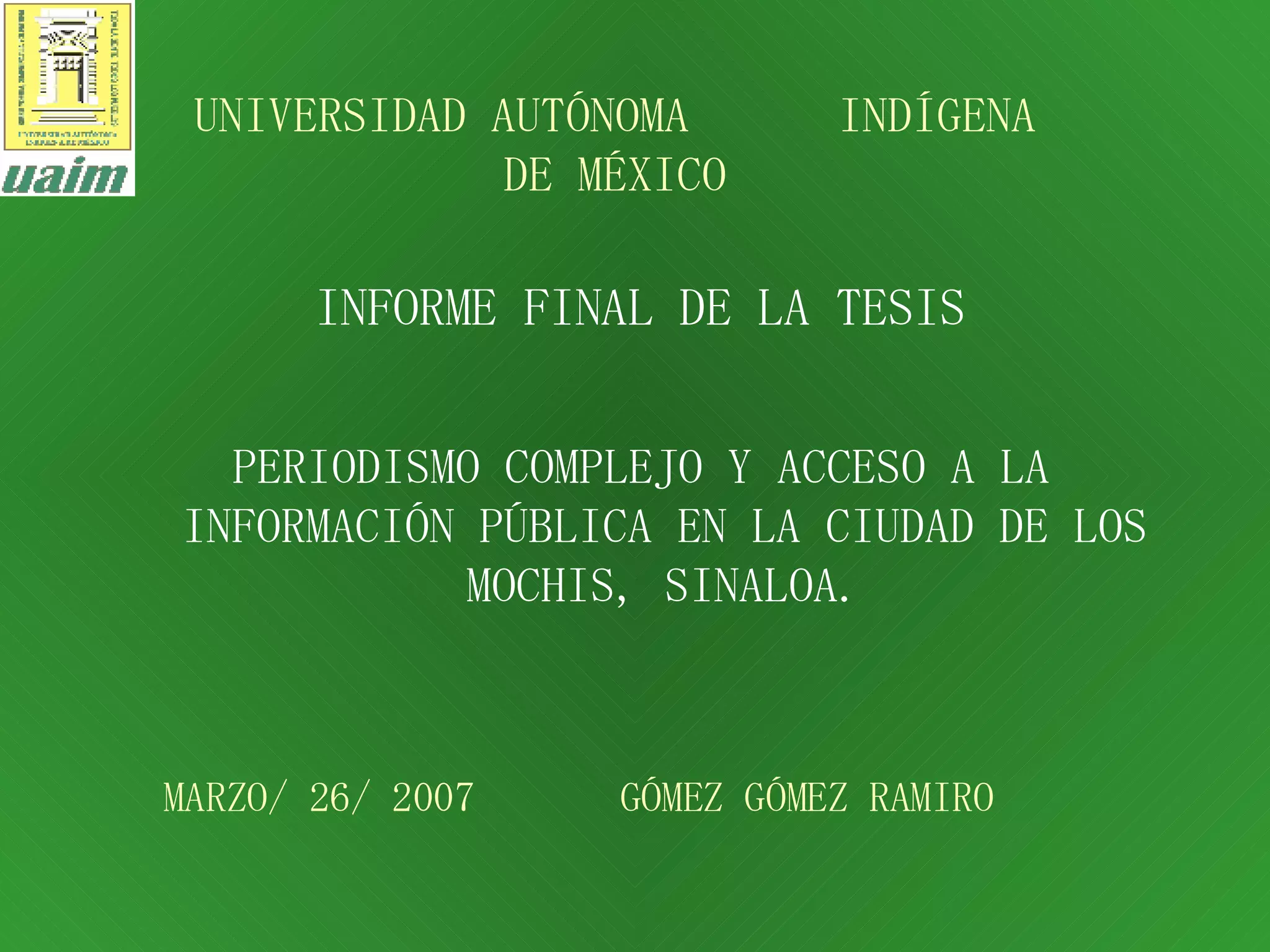 El documento analiza el periodismo de investigación y el acceso a la información pública en Los Mochis, Sinaloa. Examina si la prensa local realiza periodismo de investigación complejo basado en el acceso a información gubernamental. Propone que los periodistas ejerzan un periodismo de investigación desde una perspectiva de pensamiento complejo, utilizando el derecho de acceso a la información pública para investigar temas como los sueldos de funcionarios, el gasto público y la rendición de cuentas. Concluye que este enfoque puede transformar la