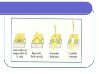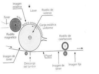 Este documento describe los diferentes tipos de impresoras, incluyendo sus características, funciones y procesos de impresión. Explica que las impresoras permiten imprimir texto y gráficos en papel y cubre impresoras de matriz de punto, de inyección de tinta, láser e incluye detalles sobre sus velocidades, resoluciones, interfaces y mecanismos.