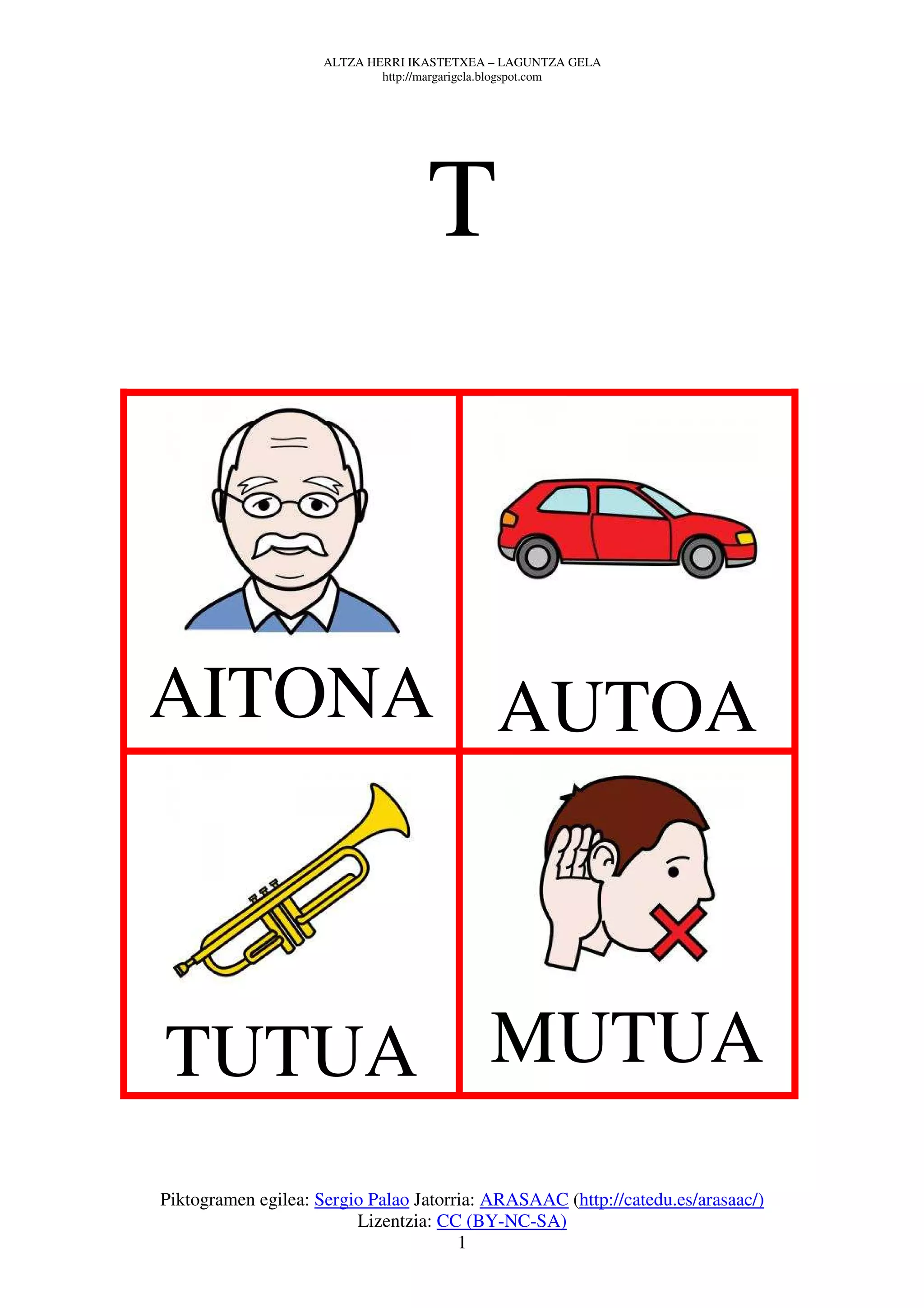 El documento presenta una serie de piktogramas (imágenes) que representan palabras en euskera relacionadas con objetos cotidianos como "casa", "puerta", "coche", "tomate", "moto", entre otros. Los piktogramas se muestran de forma individual y en diferentes combinaciones para trabajar en el reconocimiento y lectura de palabras.